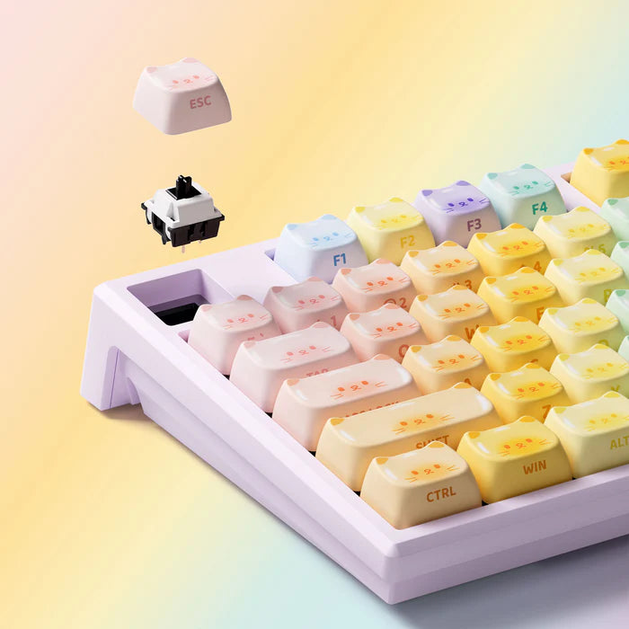 The ergonomic MAO profile keycaps offer a delightful and comfortable typing experience. Made from durable PBT material with dye-sublimation printing, they feature vibrant, steamed cat-inspired designs that resist wear and fading.