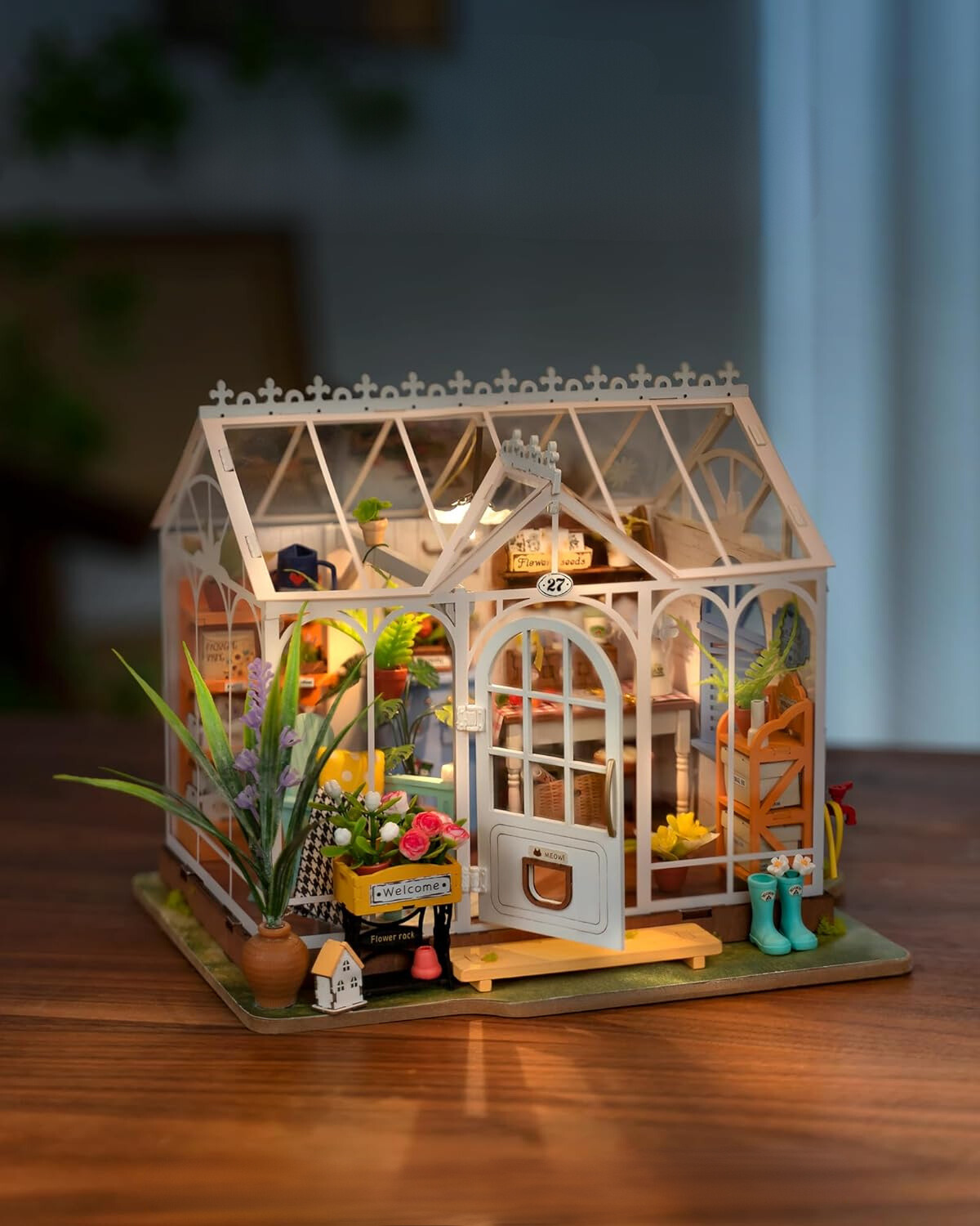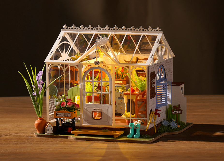 In the ceiling is an LED flower chandelier that lights up the whole garden house, perfectly showcasing the objects inside during nighttime with a warm atmosphere.