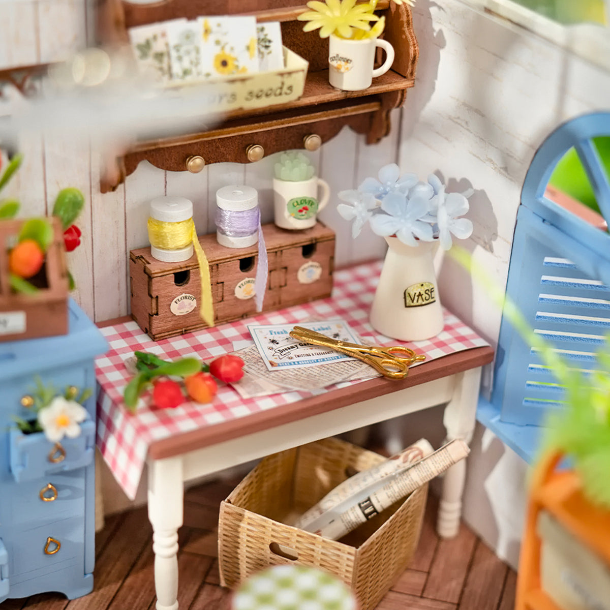 In terms of the perimeter and other spots in the garden house, there is a flower planting area and a flower garden where seeds, watering cans, planting pots, and more gardening kits are in the scene that show perfection in a gardening workspace.