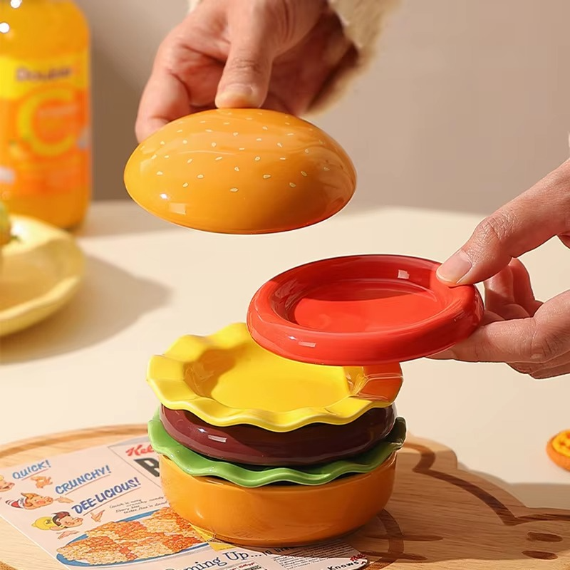 A playful twist on everyday tableware. Each piece is shaped like a burger layer, from bun to patty, making your table setting instantly fun and memorable.