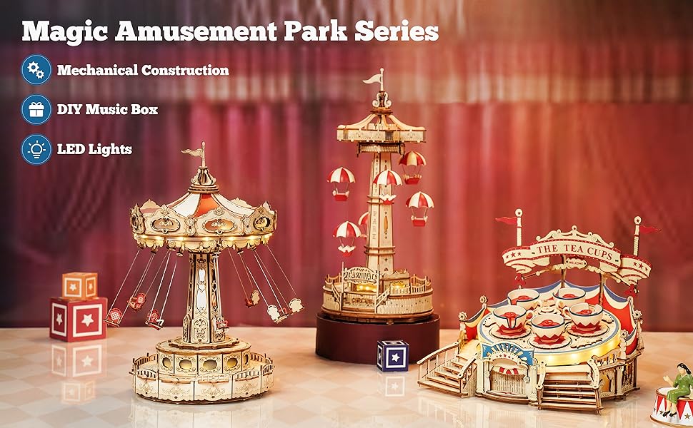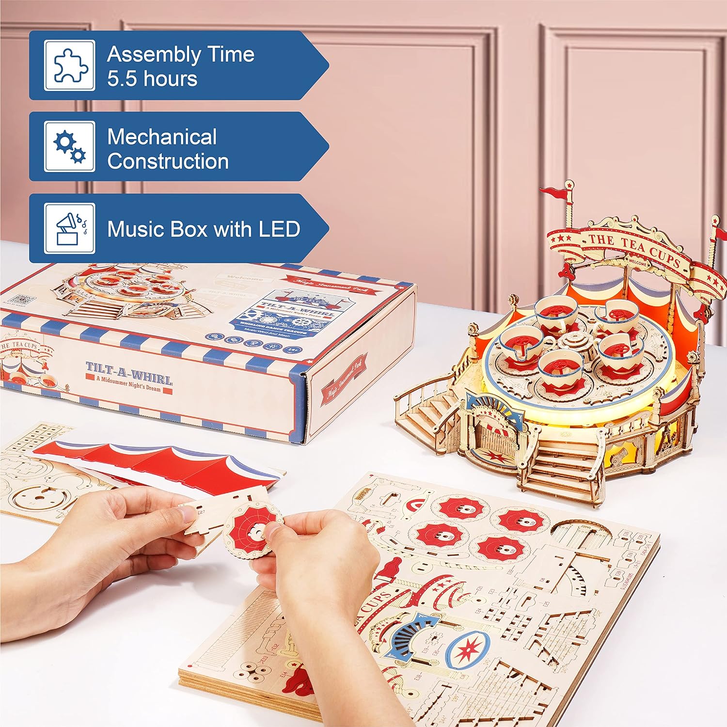 With the music 'Wind and Moon' playing slowly, this whole DIY music box kit is an amazing vibrant stage play. Challenge yourself by assembling all the pieces together and build this Tilt-A-Whirl music box wooden puzzle kit.
