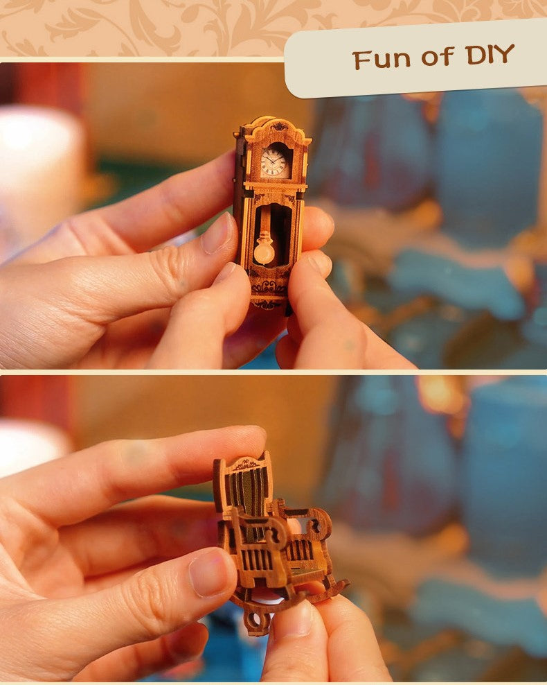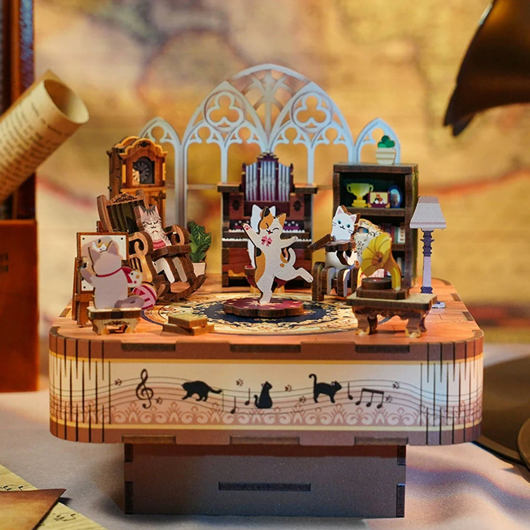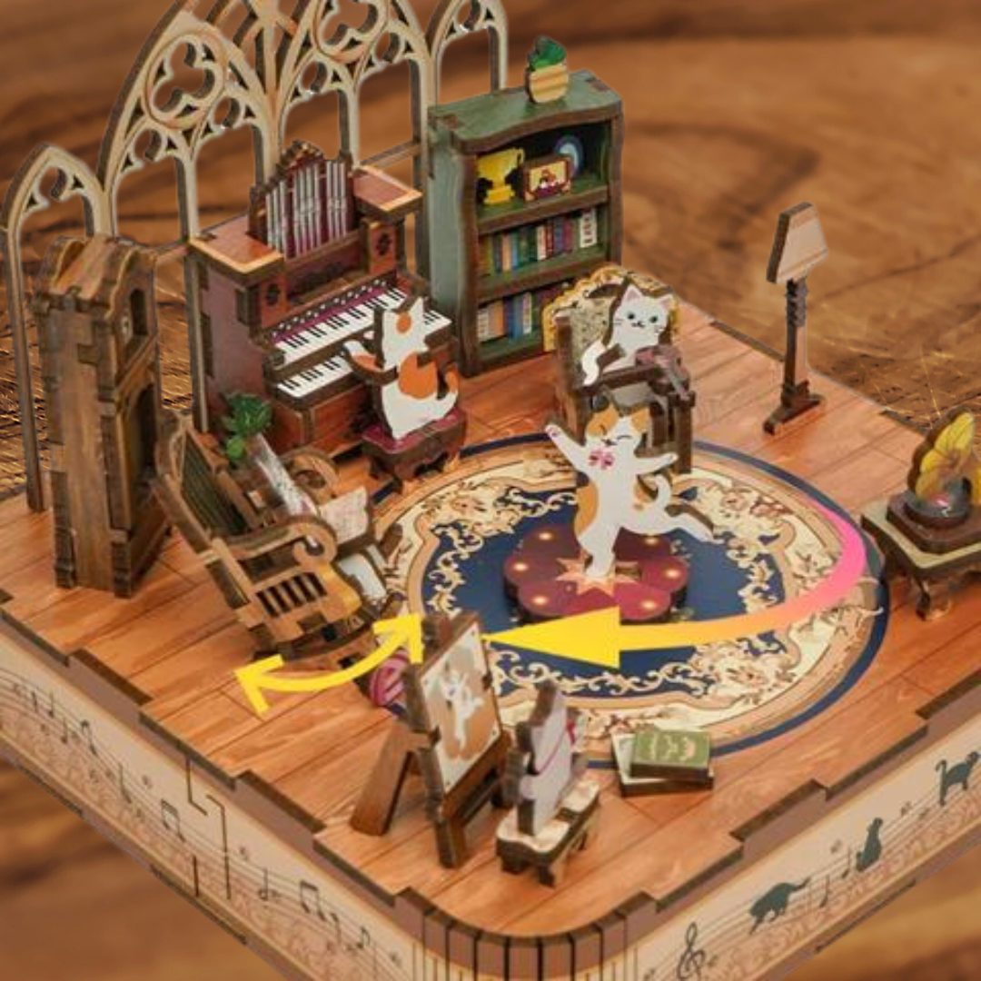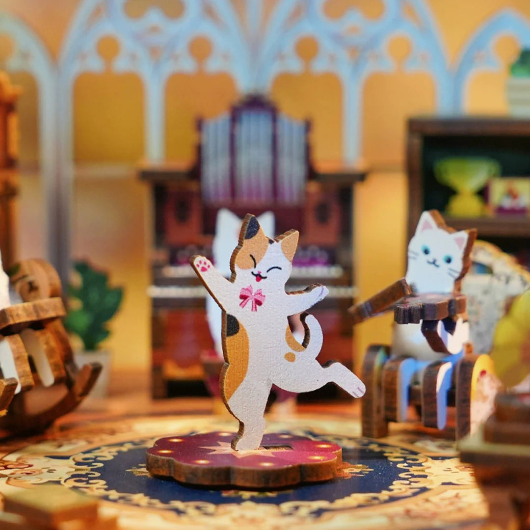 Every element has been carefully handcrafted to transport you to the fantastic cat's party. The kitten is dancing to the music, Grannny Cat's chair is swaying gently. Another cat is playing the piano and another one is painting a cute kitty art.