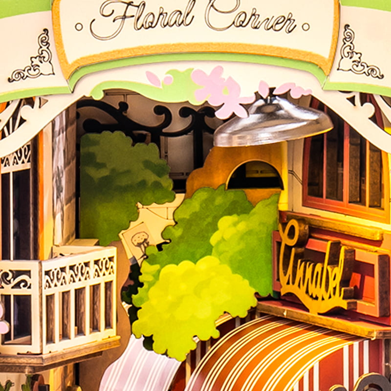 You'll appreciate the rich details and vivid colors integrated into the Floral Corner like the striped awning, artsy signage, and delicate balconies.