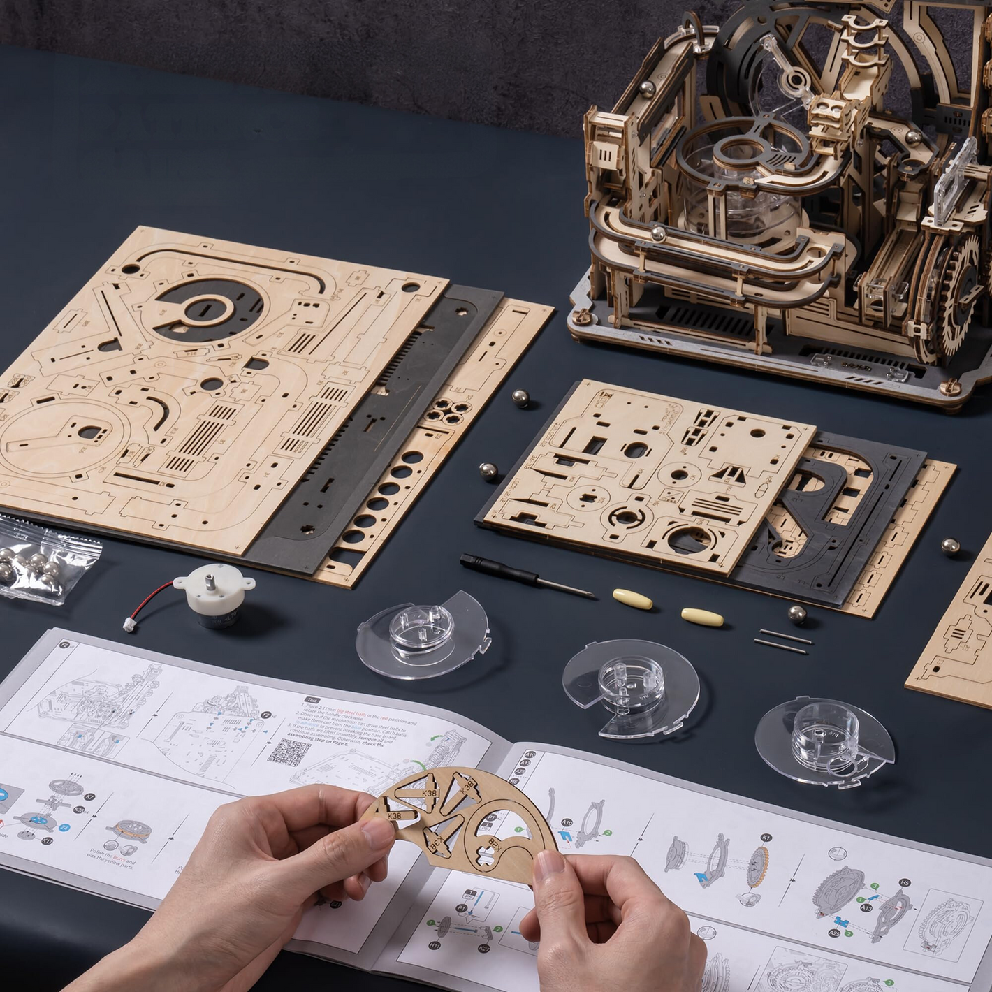The Marble Spaceport features a vertical reciprocating lifting stairs mechanism, designed to function like an elevator for marbles. This intricate system continuously lifts the marbles to the top in a smooth, Z-shaped motion, preparing them for another exciting descent. The mechanism carefully raises each marble step by step, creating a fascinating, rhythmic movement as they ascend to the starting point.