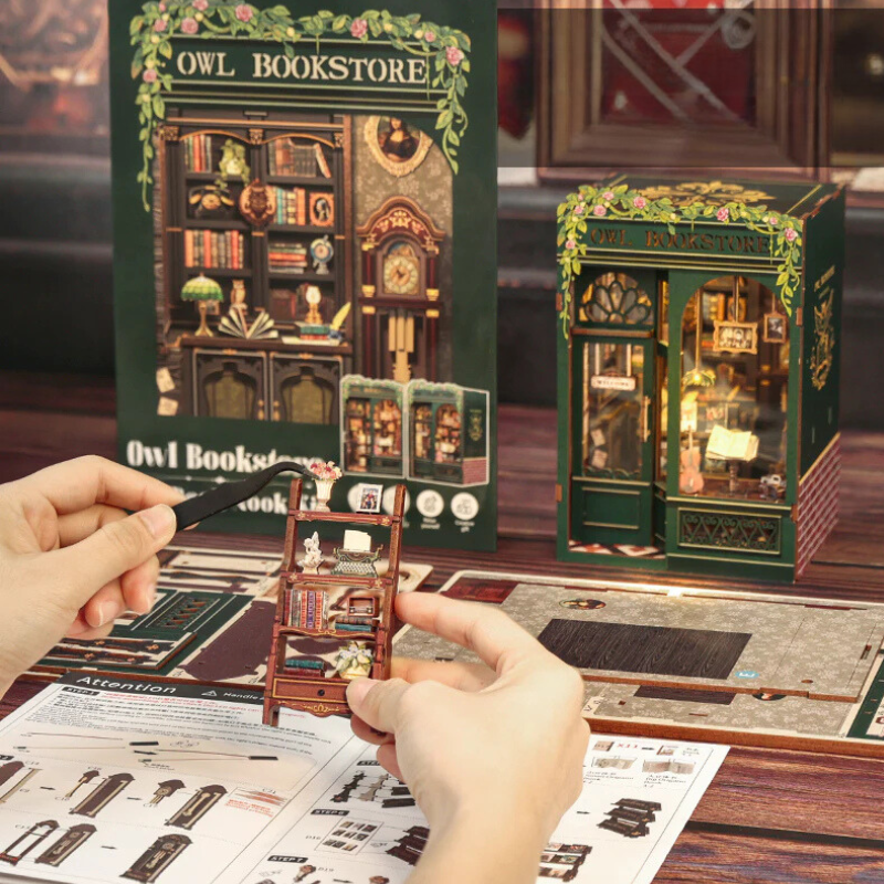 The Owl Bookstore DIY Book Nook features a charming openable door, inviting you to step into its detailed world. This functional element enhances the interactive experience, allowing you to "enter" the miniature bookstore and explore its beautifully crafted Renaissance-inspired interior, adding a layer of realism and magic.
