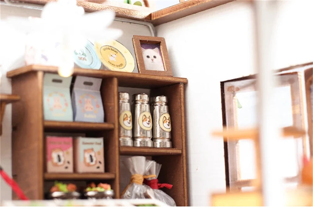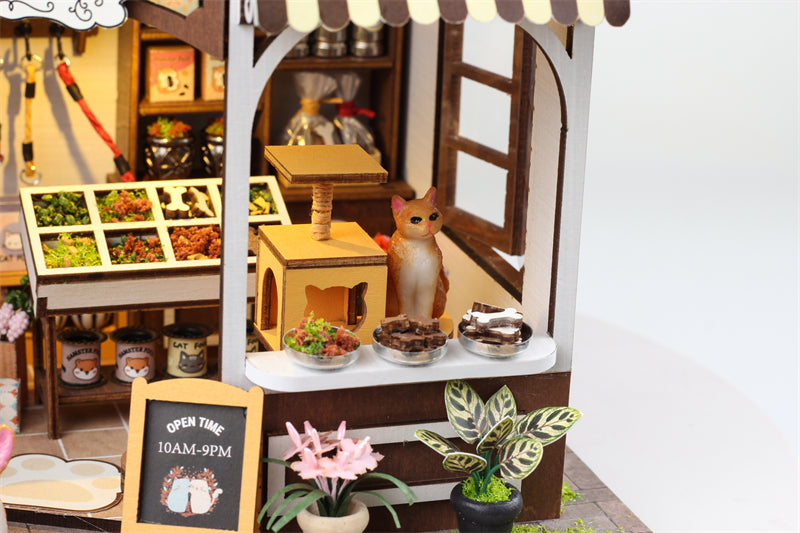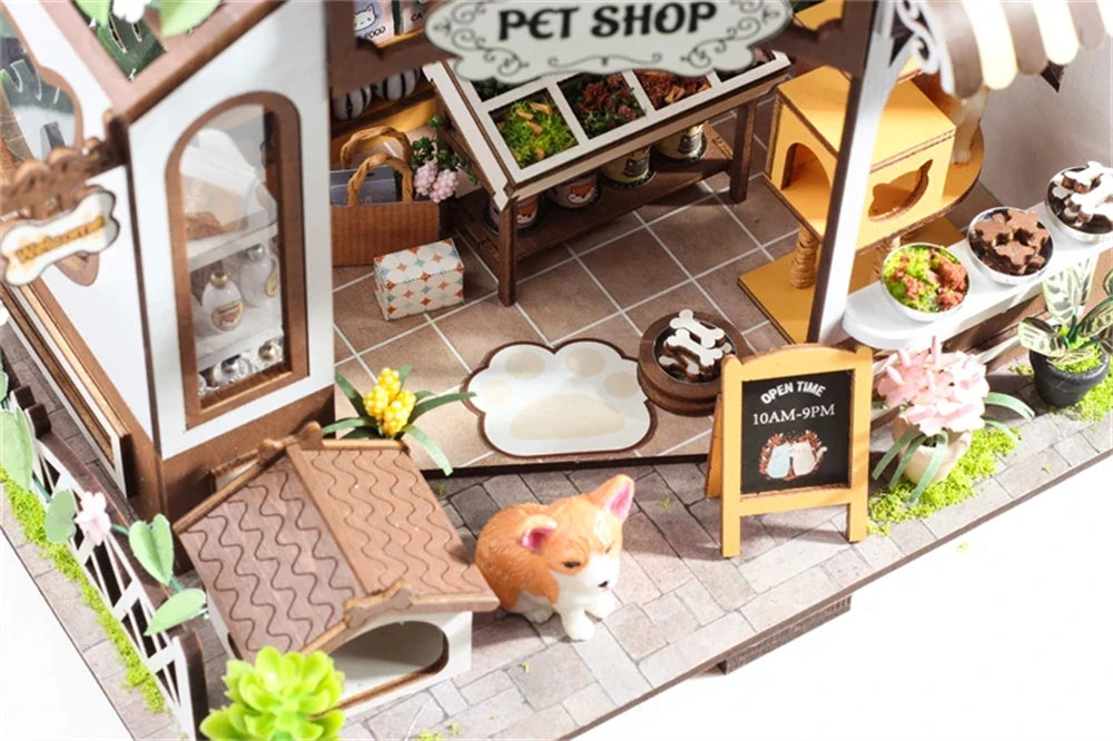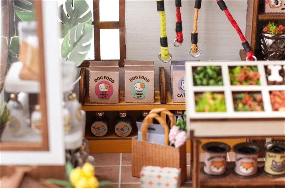Miniature shelves, counters, and display cases can be filled with tiny products like pet food, grooming supplies, and treats replicating the interior of a real pet shop.