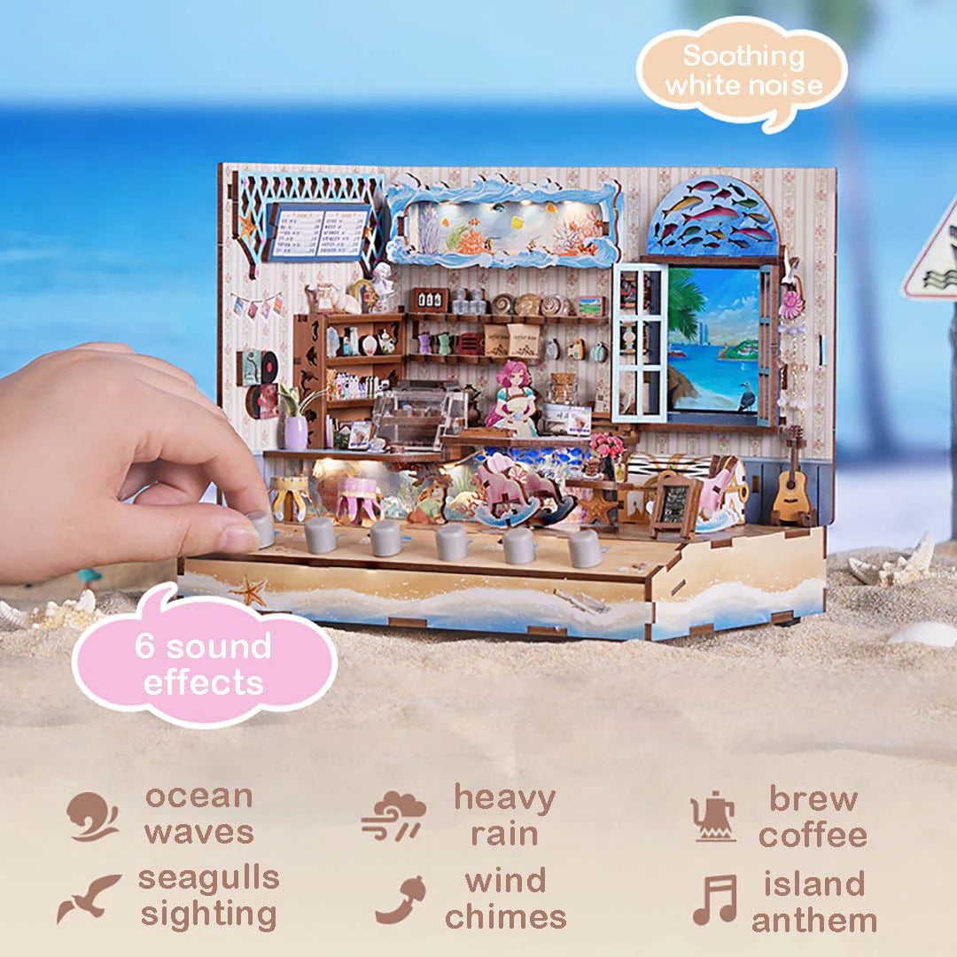 Dive into a serene coastal escape with the Seaside Cafe TechArt DIY Music Box. This beautifully crafted music box transports you to a tranquil beachside cafe, complete with the soothing ambiance of the sea. Featuring six unique knobs, each one brings a different element of the beach to life: listen to the gentle ocean waves, feel the calm of heavy rain, enjoy the comforting sound of coffee brewing, hear the distant calls of seagulls, relax to the soft melody of wind chimes, and immerse yourself in the island anthem.