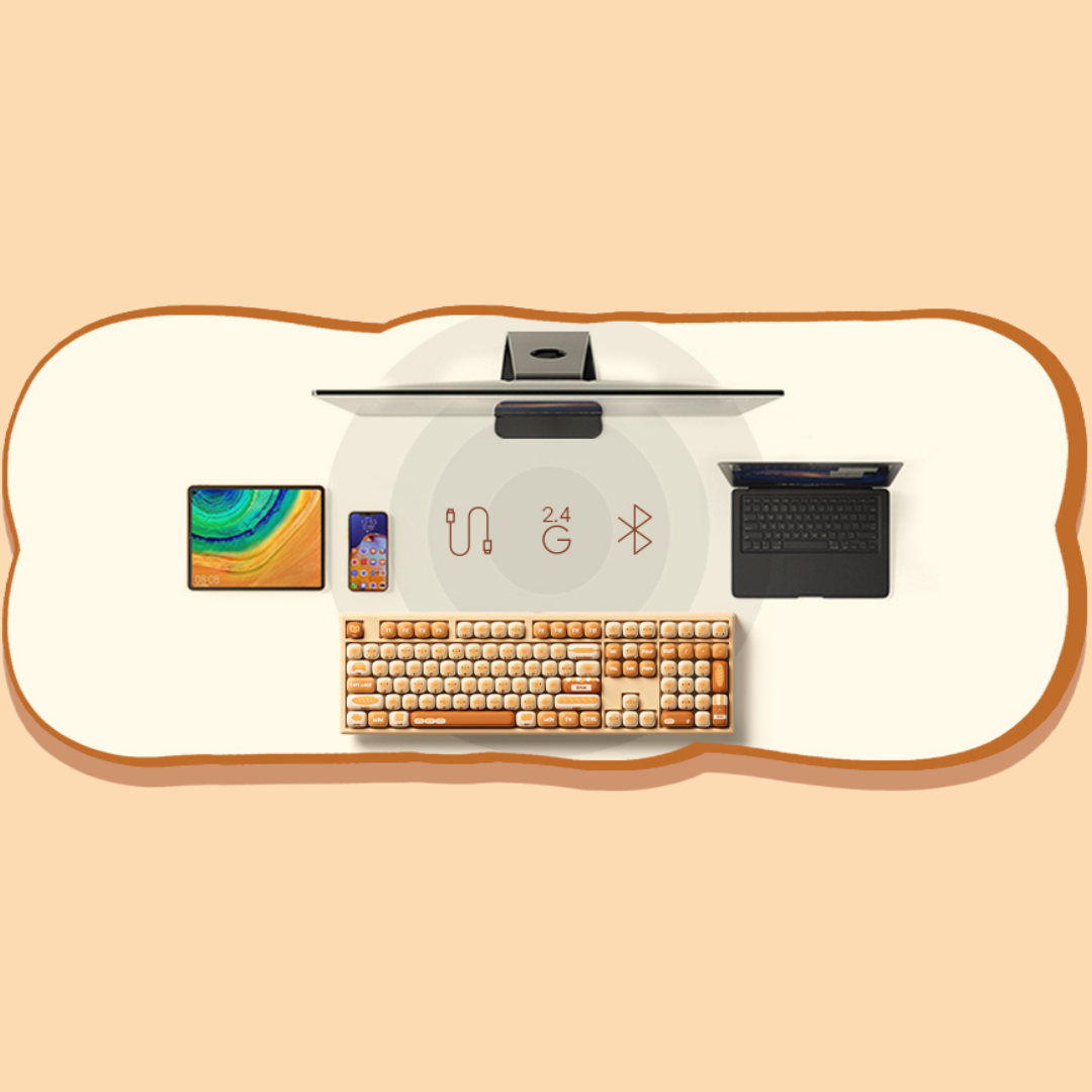 The WonderBun Toasted Bread Keyboard can be connected to multiple devices through bluetooth 5.0 (for 108 Keys only), multi-host 2.4Ghz (with a receiver), and wired Type-C modes with easy switch.